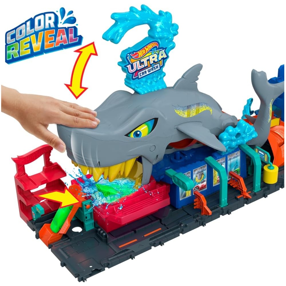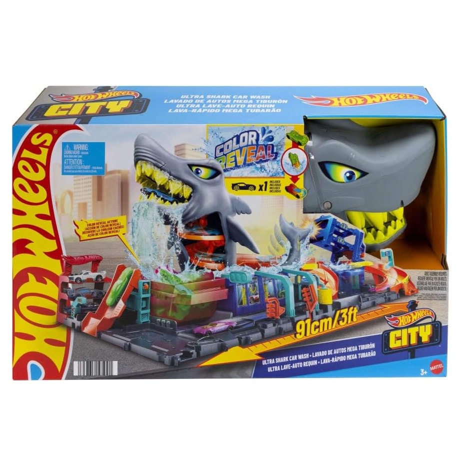 - Sumérgete en el lavado de autos Hot Wheels City Ultra Shark para un juego interactivo y cambiante de color en un lugar destacado en la serie de Netflix, «Let’s Race!»