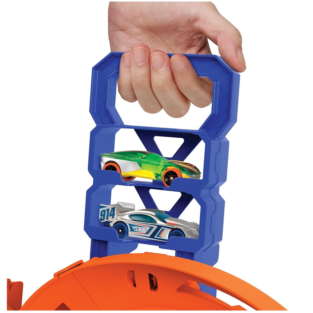 - El conjunto se pliega por la mitad y cuenta con espacio de almacenamiento para 2 autos de juguete en el mango.