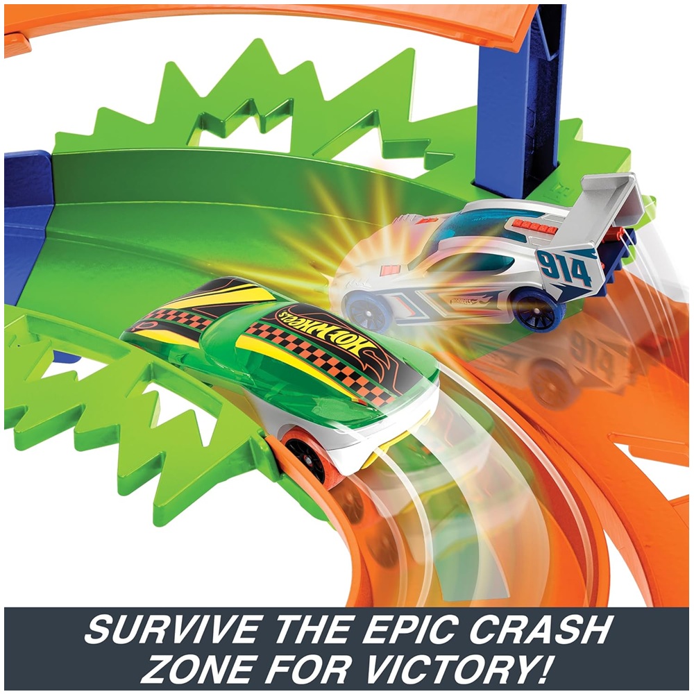 ¡Compite con dos Hot Wheels en pistas paralelas, haz acrobacias en un salto y escapa de la zona de impacto para ser el primero en terminar la pista Whip Around!