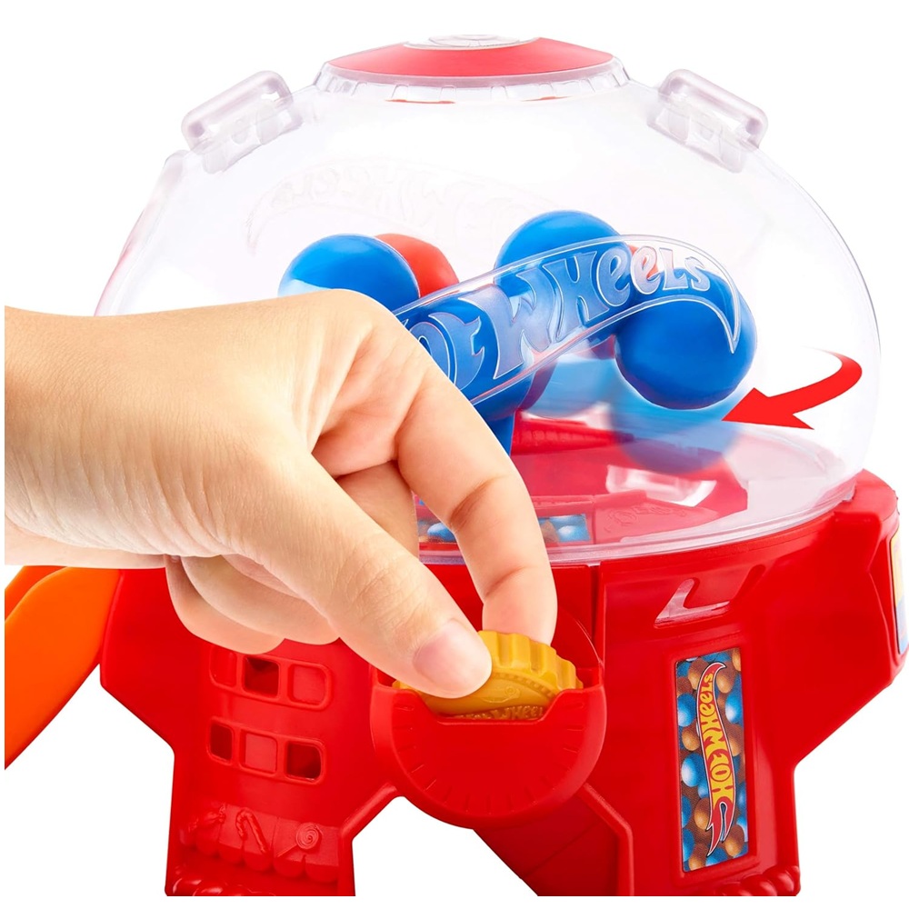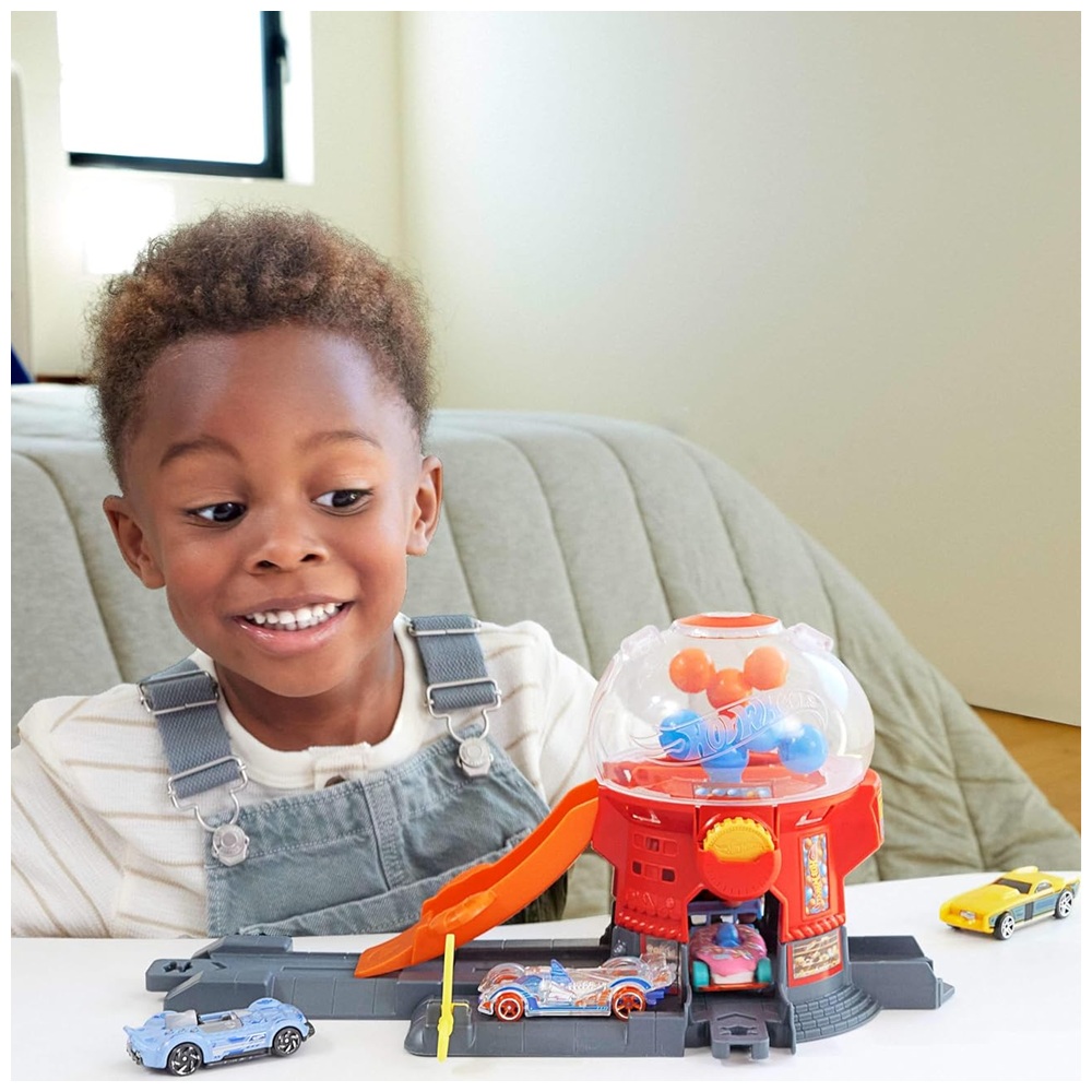 Este set con forma de máquina de chicles inspira la creatividad mientras los niños conducen sus coches de juguete por la rampa de caída libre hasta la máquina.