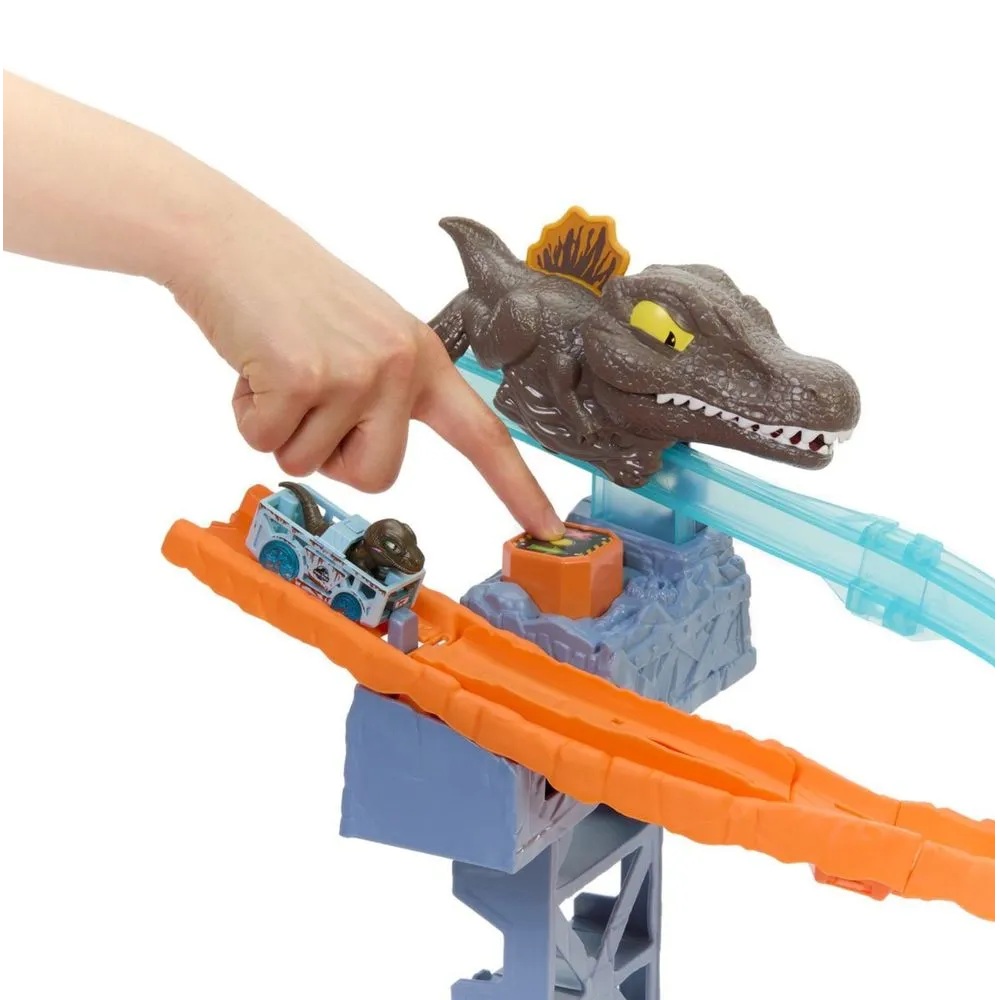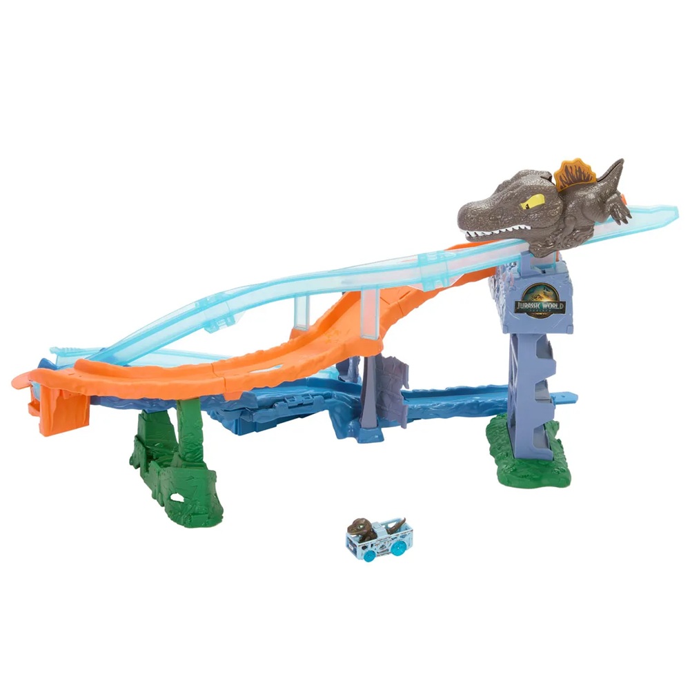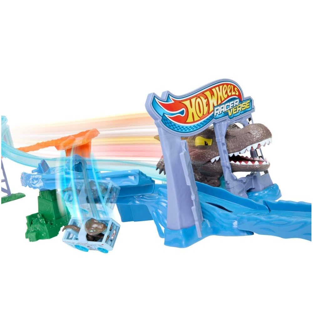 ¡Es una carrera por la supervivencia en la pista! El set Hot Wheels RacerVerse Jurassic World Crash & Splash Track Set te sumerge en una épica batalla donde un Velociraptor die-cast de RacerVerse se enfrenta al hambriento Spinosaurus. ¿Quién será el ganador de esta feroz contienda?