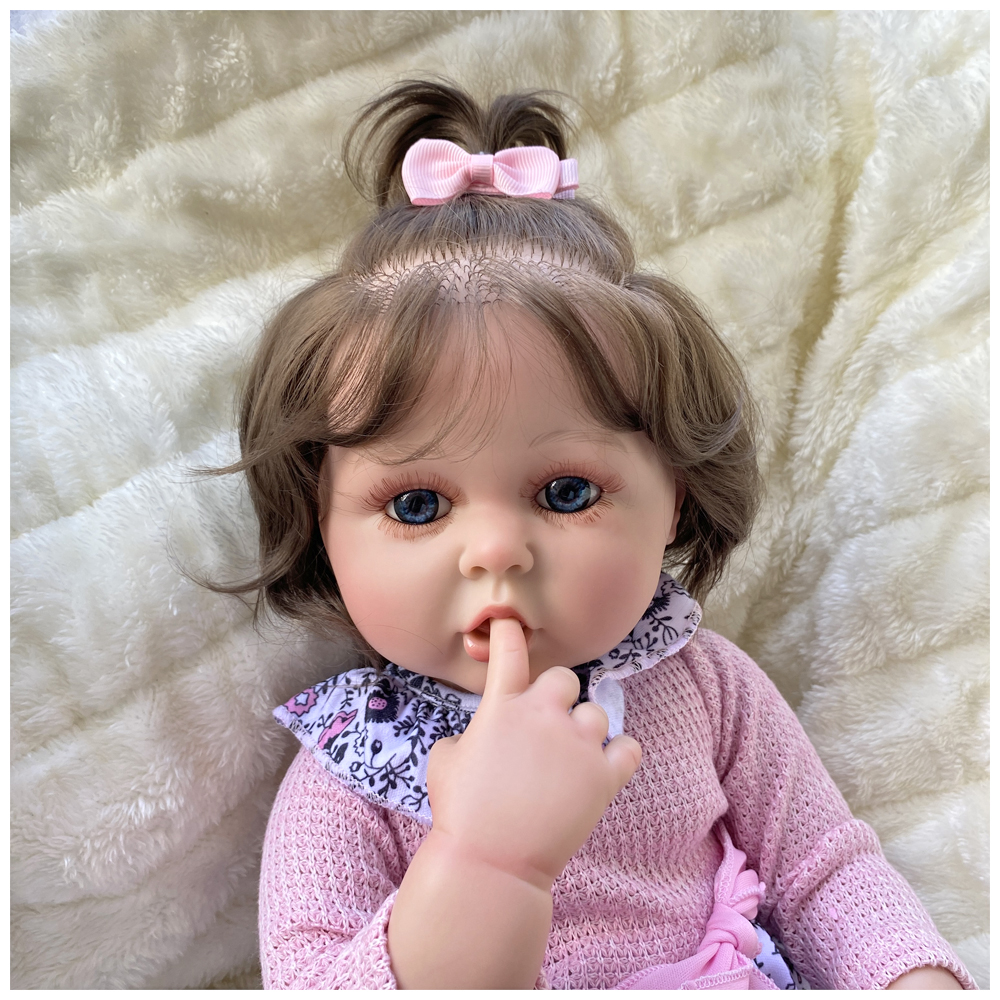 Con una longitud de 55 cm (22 pulgadas) y un peso aproximado de 1.5 kg, este bebé reborn presenta detalles realistas en el rostro, manos y pies, además de cabello suave implantado a mano, que aporta aún más realismo y encanto, evocando la dulzura de una recién nacida.