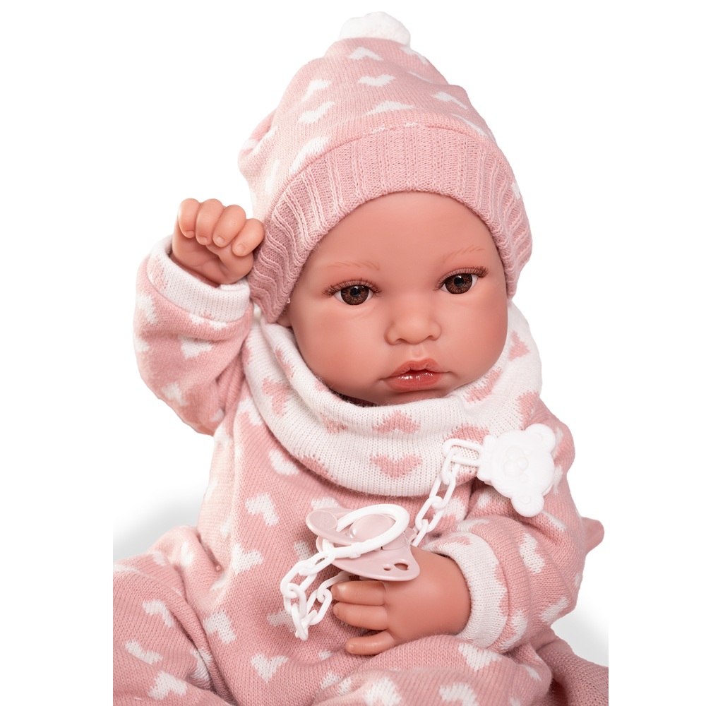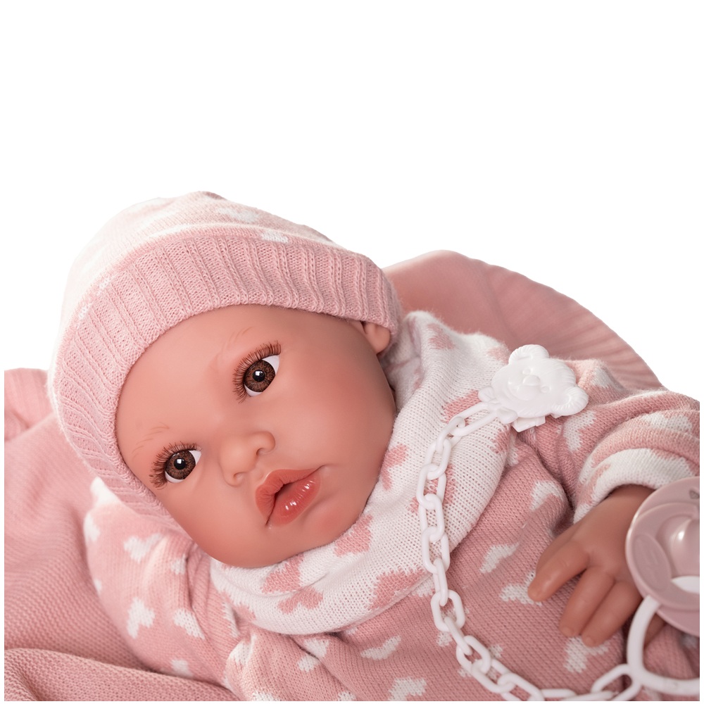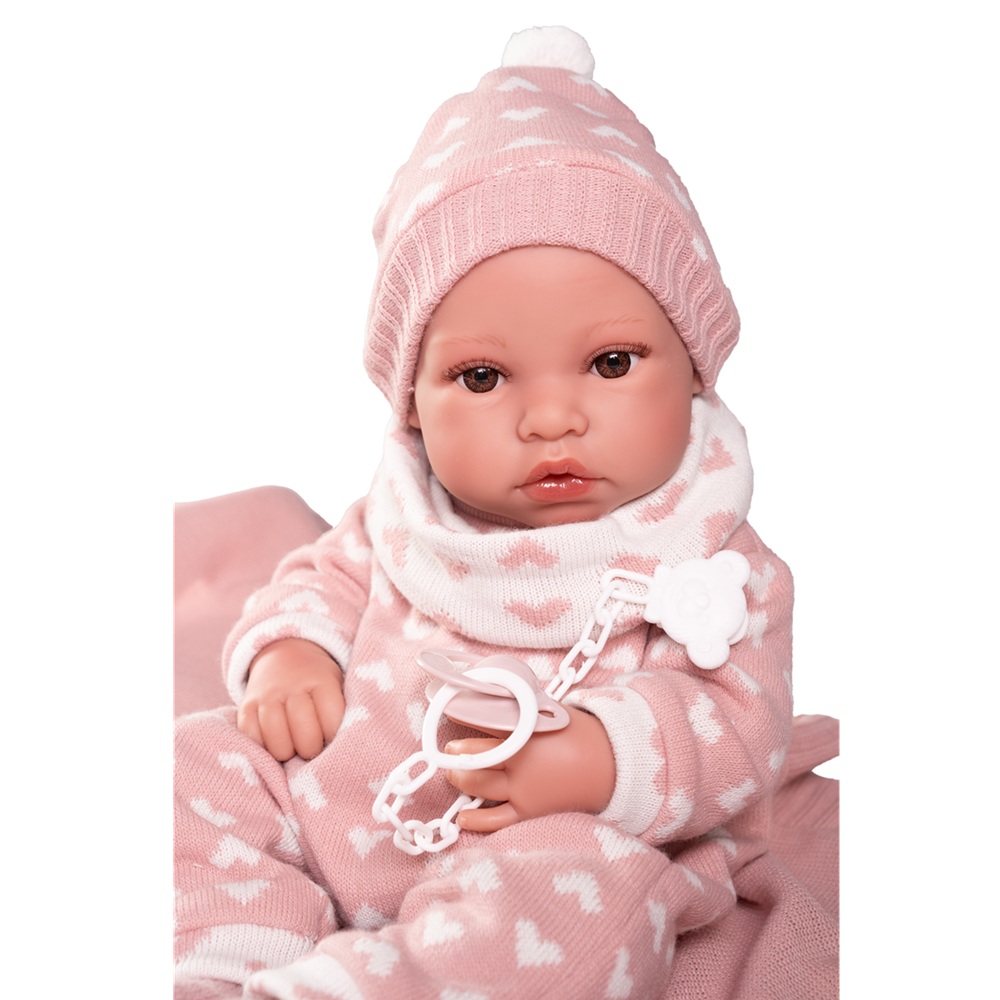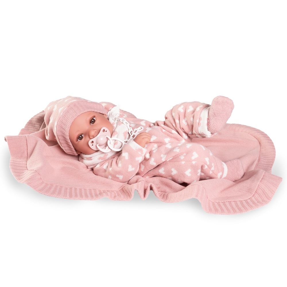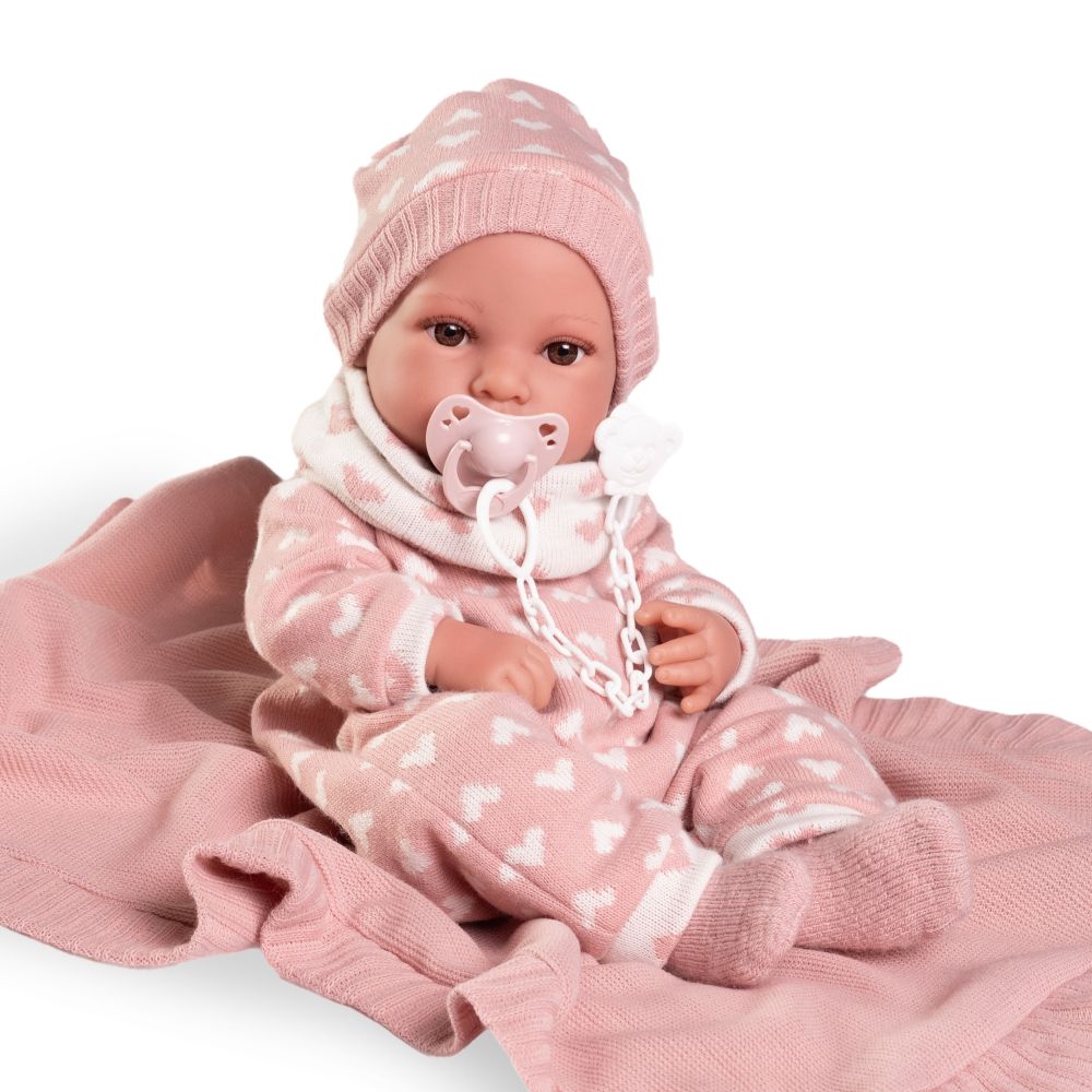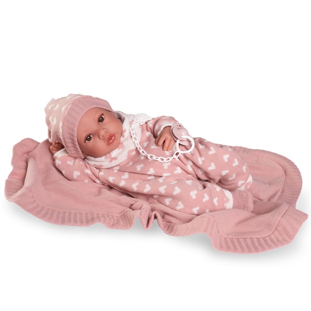 Erika es la nueva carita de nuestros Recién Nacidos. Lleva un pelele de corazones a conjunto de su gorrito. Como le encanta que la mimen, la puedes arropar con su mantita de color rosa. Su cuerpo es de suave vinilo sexuado. Mide 42 cm y le encantará jugar contigo. ¿Hay algo más adorable que un bebé?