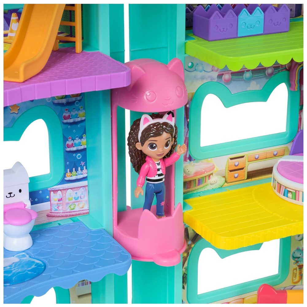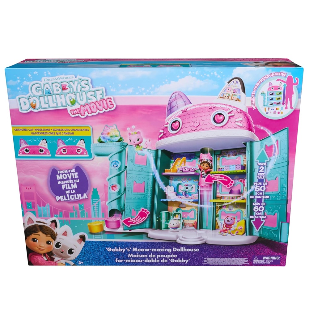 Lleva a casa toda la magia de la Casa de Muñecas de Gabby: La Película. La Casa de Muñecas Meow-tástica mide más de 60 cm de alto y cuenta con ojos lenticulares para una emocionante experiencia de juego.