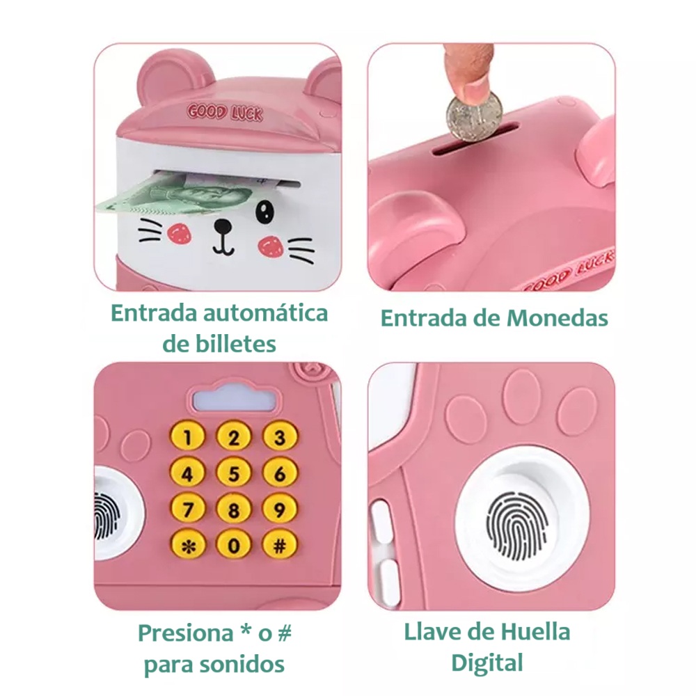 ¡Hacer que ahorrar sea divertido y seguro para los más pequeños nunca fue tan fácil! Presentamos esta encantadora y práctica alcancía electrónica con un diseño de gatito con orejitas, ideal para enseñar a tus hijos el valor del ahorro de una forma moderna y entretenida.