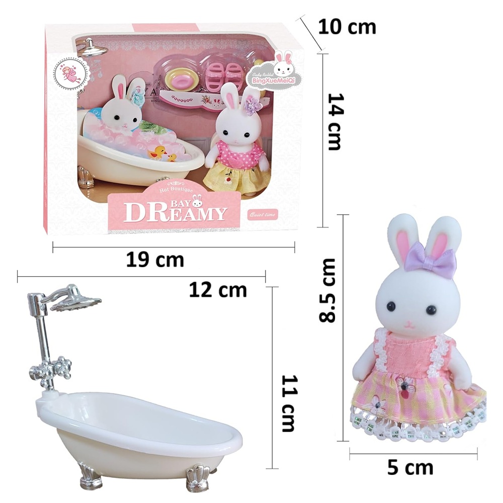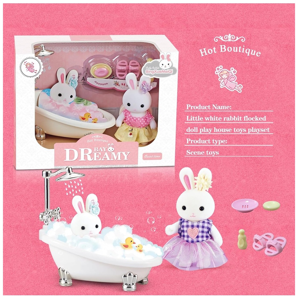- Incluye: muñeca flocada de conejito blanco, bañera, dos sandalias, jabón, shampoo y más accesorios
