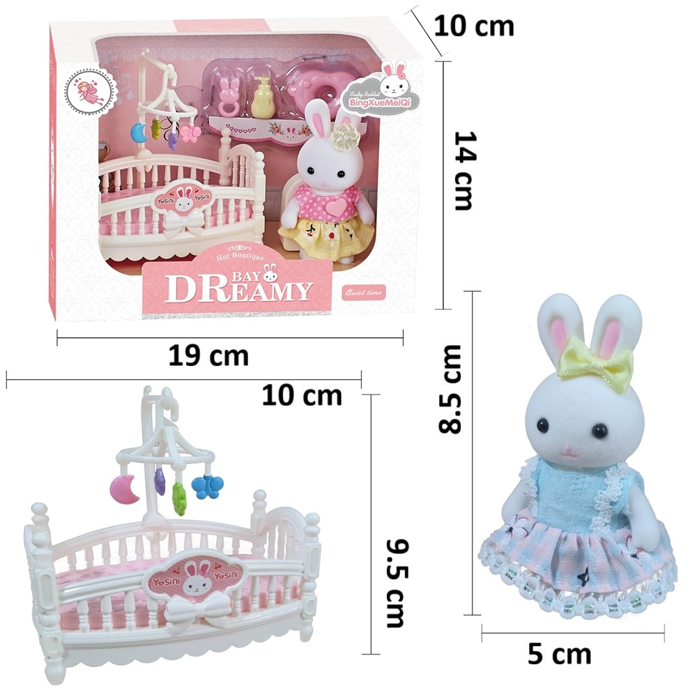 - Incluye: muñeca flocada de conejito blanco, cuna, movil, sonaja, shampoo y más accesorios