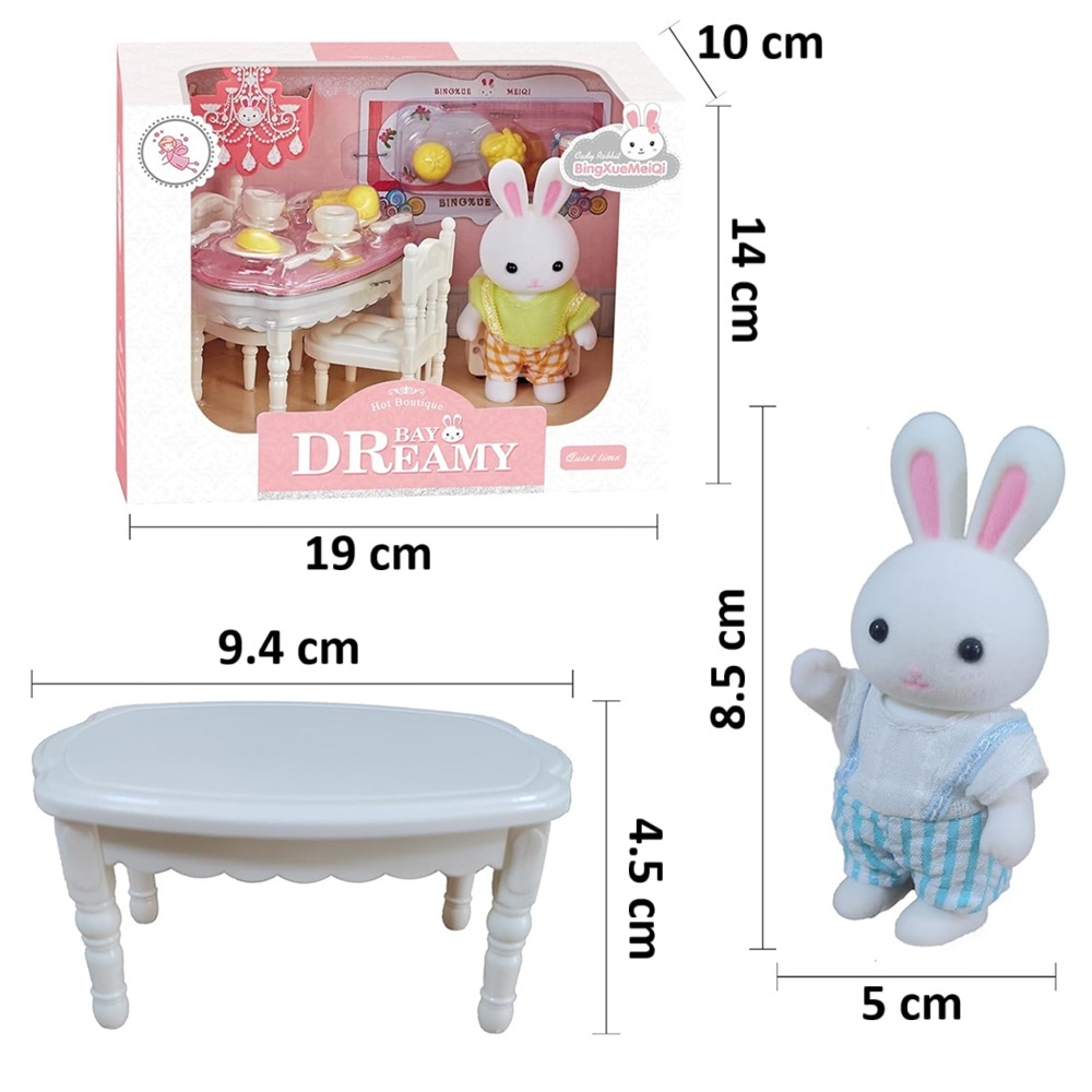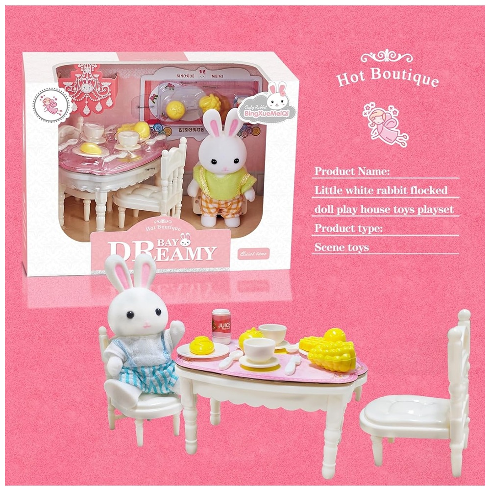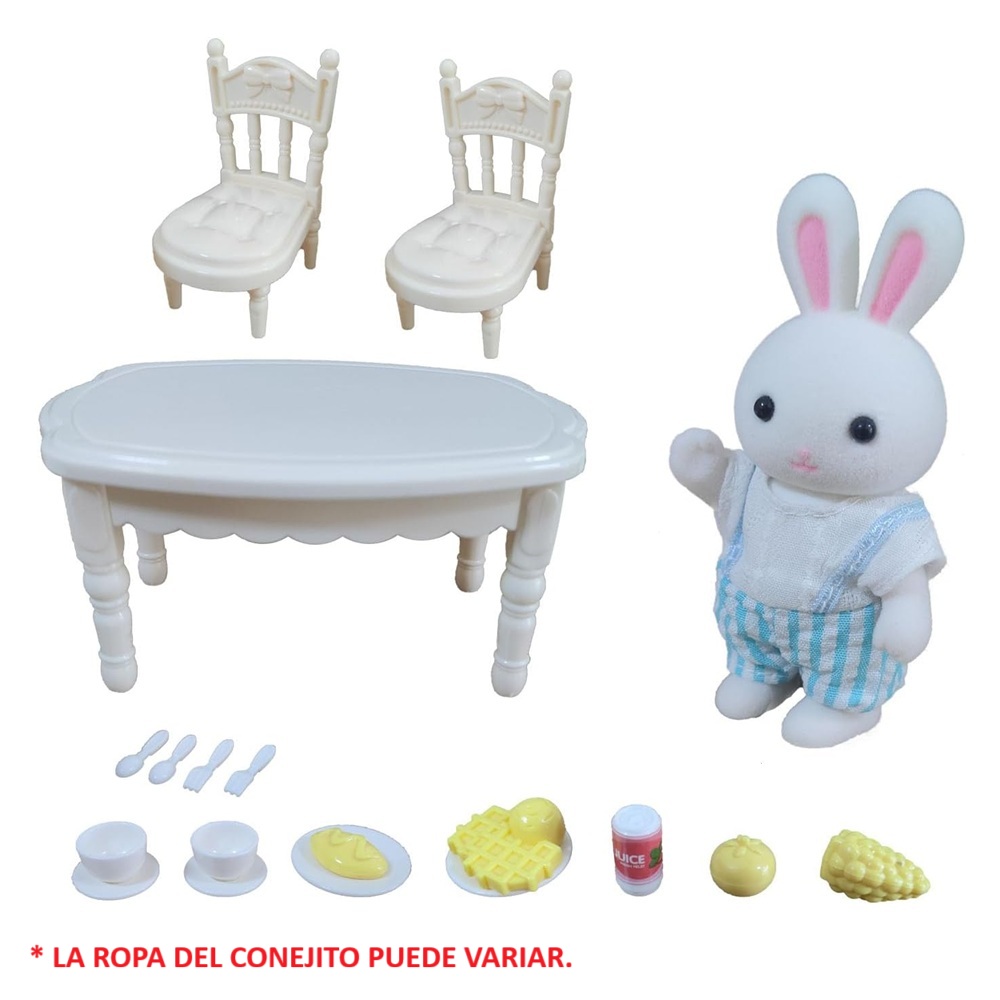 - Incluye: muñeca flocada de conejito blanco, mesa de comedor, dos sillas, cubiertos, comida y más accesorios.