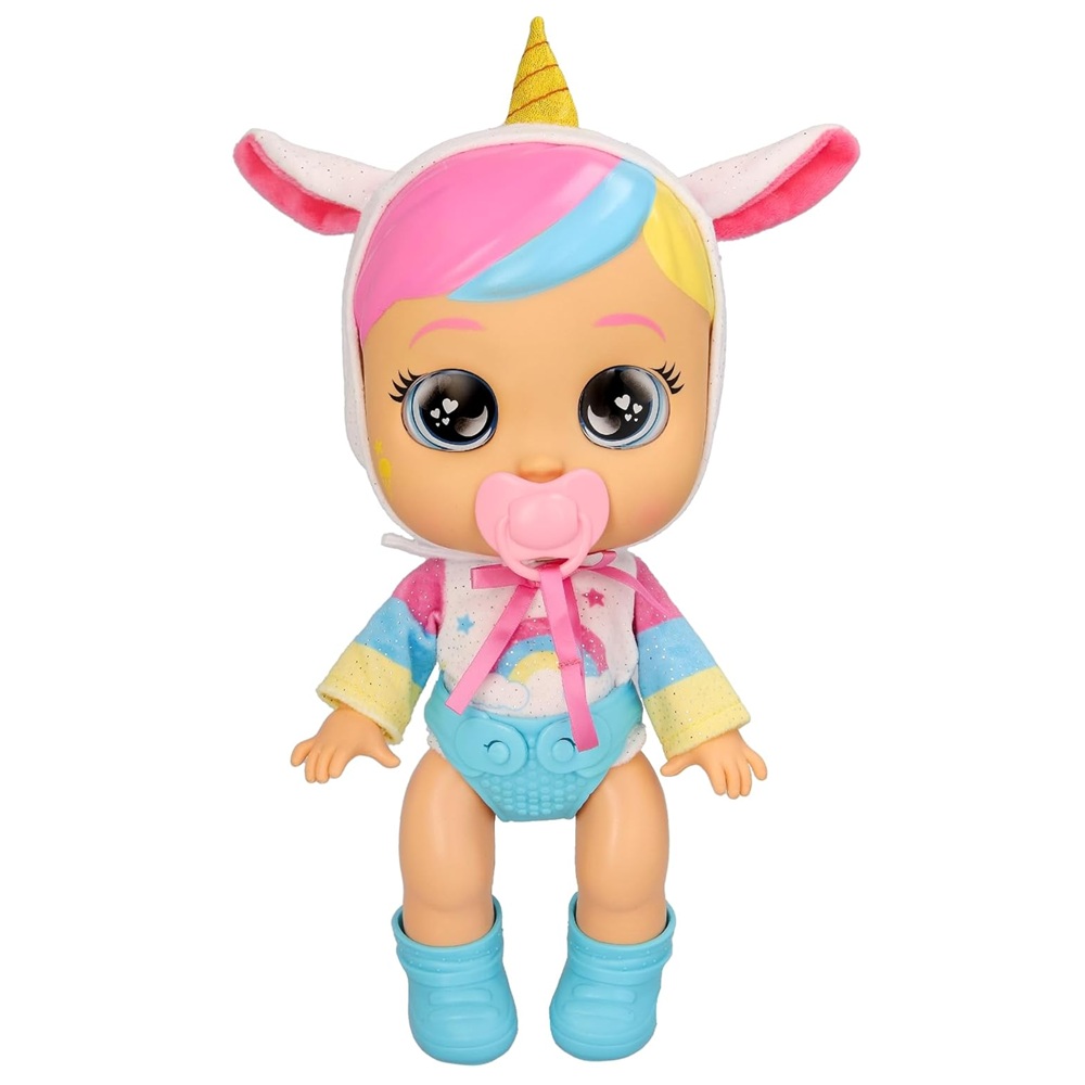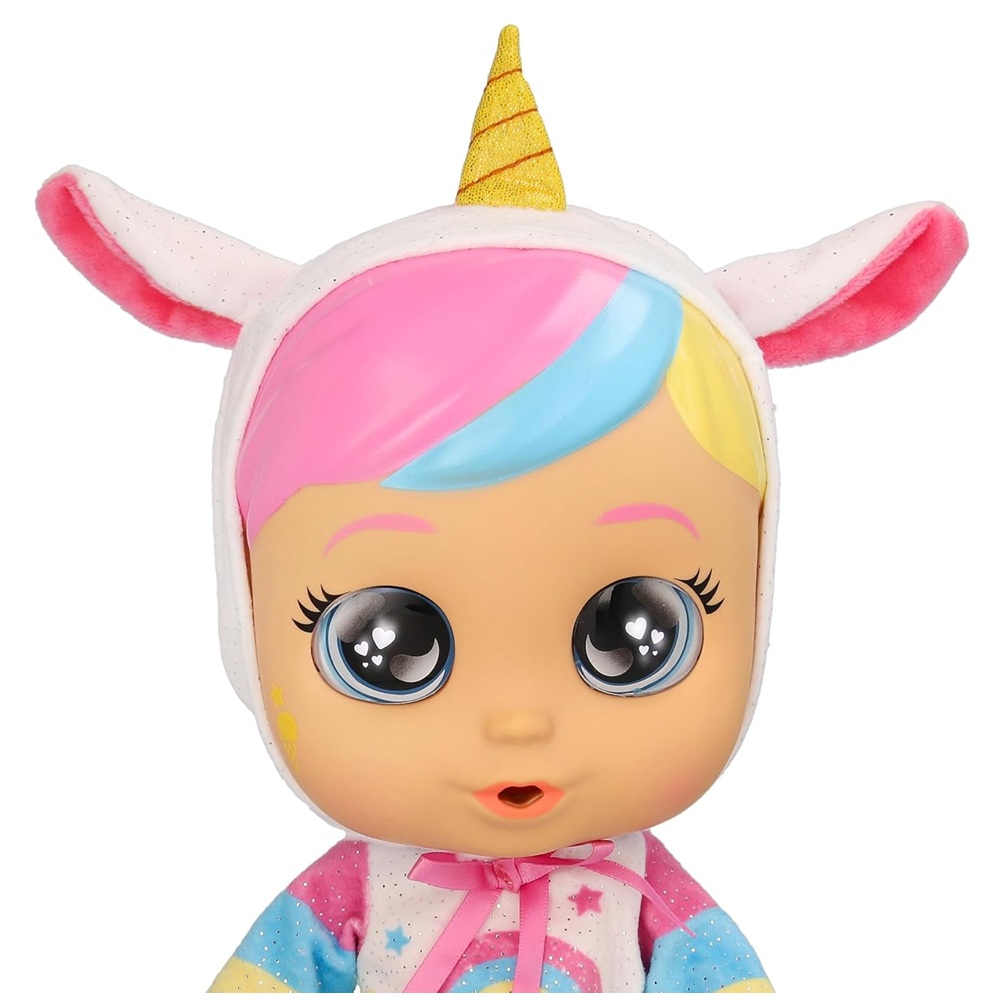 Dreamy está lista para ir a la guardería con su sudadera con capucha y pañal de unicornio de fantasía personalizados. ¡Ella llora lágrimas reales con corazones iluminados en sus ojos!