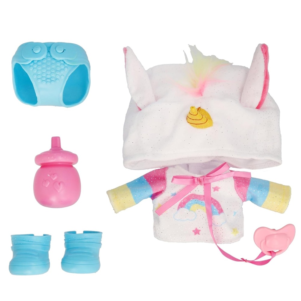 - 5 accesorios incluidos: un pañal, sudadera con capucha personalizada, un par de zapatos, un biberón y un chupete a juego.